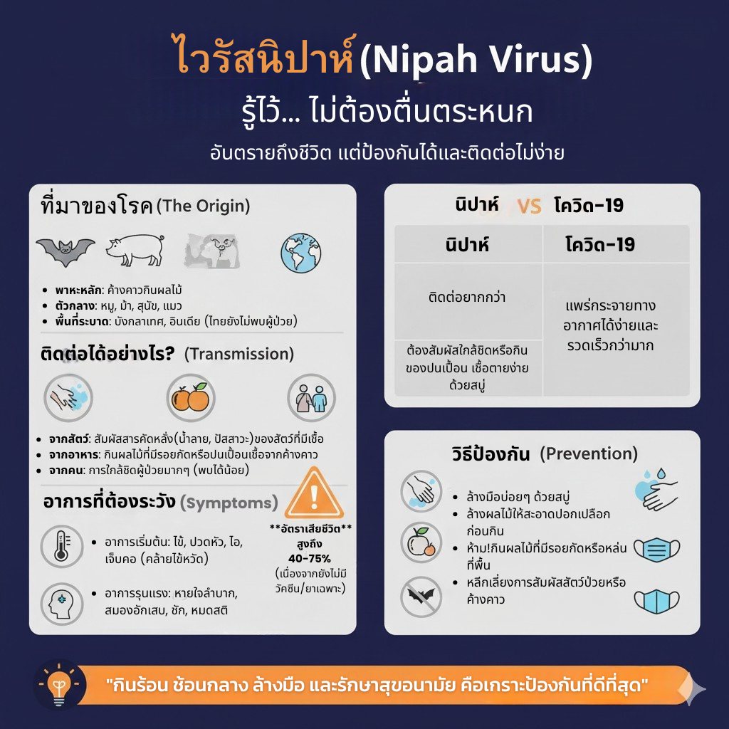 ไวรัสนิปาห์เป็นโรครุนแรงที่มาจากค้างคาวผลไม้ มีการระบาดเป็นระยะในบางประเทศ แต่ติดต่อยากกว่าโควิดมากในชีวิตประจำวันความเสี่ยงต่ำ หากรักษาสุขอนามัย กินอาหารสะอาด และหลีกเลี่ยงการสัมผัสสัตว์ป่วย ไม่ต้องตื่นตระหนก แต่ควรรู้จักป้องกันตัวเอง