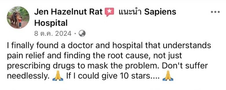 In France, medical care is free for citizens, but it wasnt good enough. When I came to Thailand, I spent 7 years searching for the best hospital, until I found Sapiens. The team here is kind and attentive. For the first time, I am free from the pain that had tormented me for so long.