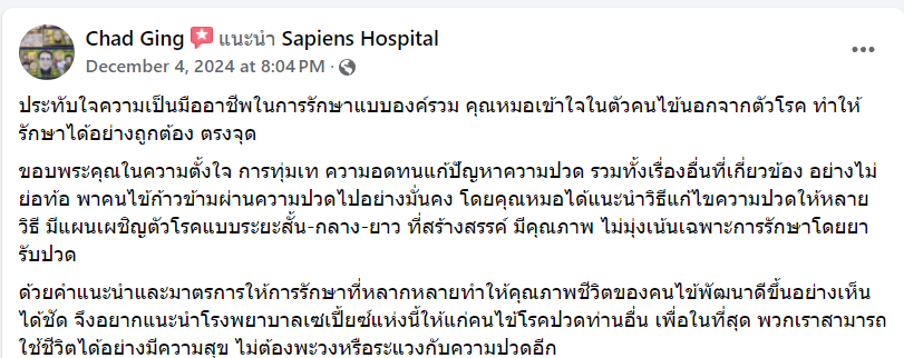 He expressed appreciation for Dr. Nattaya, not only for the treatment but also for the knowledge she provided about daily living. He also praised the hospitals atmosphere modern, beautiful, and very comfortable.